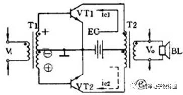 它由兩個特性相同的晶體管組成對稱電路,在沒有輸入信號時,每個管子都處于截止?fàn)顟B(tài),靜態(tài)電流幾乎是零,只有在有信號輸入時管子才導(dǎo)通,這種狀態(tài)稱為乙類工作狀態(tài)。當(dāng)輸入信號是正弦波時,正半周時 VT1 導(dǎo)通 VT2 截止,負(fù)半周時 VT2 導(dǎo)通 VT1 截止。兩個管子交替出現(xiàn)的電流在輸出變壓器中合成,使負(fù)載上得到純正的正弦波。這種兩管交替工作的形式叫做推挽電路。