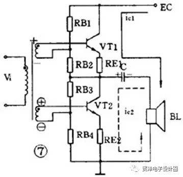 這個電路不管有沒有輸入信號,晶體管始終處于導(dǎo)通狀態(tài),靜態(tài)電流比較大,困此集電極損耗較大,效率不高,大約只有 35 %。這種工作狀態(tài)被稱為甲類工作狀態(tài)。這種電路一般用在功率不太大的場合,它的輸入方式可以是變壓器耦合也可以是 RC 耦合。