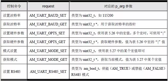 常見(jiàn)命令與對(duì)應(yīng)的p_arg 參數(shù),UART 硬件參數(shù)與UART 模式分別詳見(jiàn)表5.25、表5.26和表5.27。