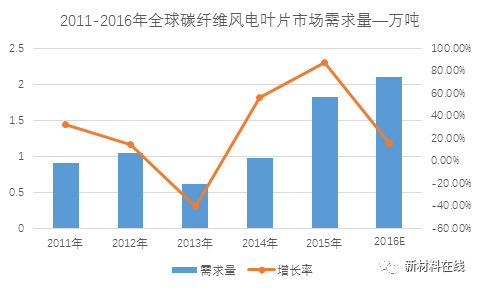 近年來,碳纖維及其復(fù)合材料在風(fēng)電葉片領(lǐng)域的使用越發(fā)的廣泛,風(fēng)電機(jī)組的大型化和海上化都極大的地拉動(dòng)對(duì)碳纖維葉片的需求,下圖為2011年-2016年全球碳纖維風(fēng)電葉片市場(chǎng)需求量。