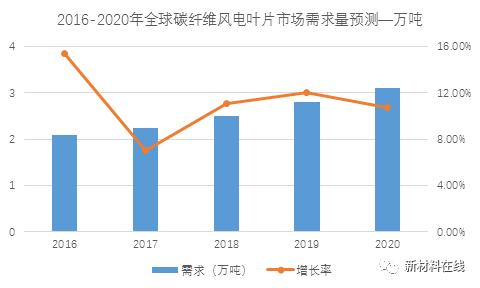下圖為2016-2020年碳纖維在風(fēng)電葉片需求量的預(yù)測(cè),從圖中可以看出,在2020年,需求量將超過3萬噸。