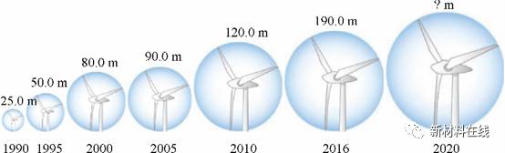 當(dāng)前風(fēng)電機(jī)組正朝著大型化、輕量化的方向發(fā)展,下圖為葉片直徑的演變圖,