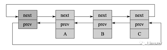 雖然理論上rcu_assign_pointer()和rcu_derederence()可以用于構(gòu)造任何能想象到的受RCU保護(hù)的數(shù)據(jù)結(jié)構(gòu),但是實(shí)踐中常常只用于構(gòu)建更上層的原語(yǔ)。例如,將rcu_assign_pointer()和rcu_dereference()原語(yǔ)嵌入在Linux鏈表的RCU變體中。Linux有兩種雙鏈表的變體,循環(huán)鏈表struct list_head和哈希表structhlist_head/struct hlist_node。前一種如下圖所示。