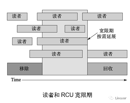 如上圖所示,RCU是一種等待已有的RCU讀端臨界區(qū)執(zhí)行完畢的方法,這里的執(zhí)行完畢也包括在臨界區(qū)里執(zhí)行的內(nèi)存操作。不過(guò)請(qǐng)注意,在某個(gè)寬限期開(kāi)始后才啟動(dòng)的RCU讀端臨界區(qū)會(huì)擴(kuò)展到該寬限期的結(jié)尾處。