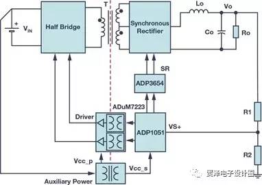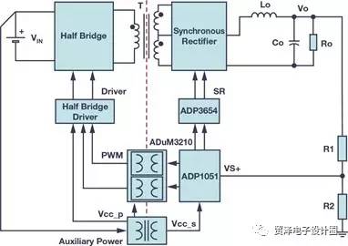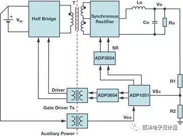 ADP1051是ADI公司先進的數(shù)字電源控制器,具有PMBus?接口,面向中間總線轉(zhuǎn)換器等高功率密度和高效率應(yīng)用。2ADP1051基于靈活的狀態(tài)機架構(gòu),提供眾多頗具吸引力的特性,比如反向電流保護、預(yù)偏置啟動、恒流模式、可調(diào)輸出電壓壓擺率、自適應(yīng)死區(qū)時間控制以及伏秒平衡,與模擬解決方案相比,減少了大量的外部元件。一般而言,ADP1051更常用于副邊控制,因為它與系統(tǒng)通信非常方便。因此,同步整流器的PWM信號以及 VOUT檢測等信號無需跨越隔離邊界與系統(tǒng)進行通信。不過在這種情況下,需要輔助電源在啟動階段從原邊向副邊控制器ADP1051提供初始電力。此外,來自ADP1051的PWM信號需要跨越隔離邊界。下文討論了三種解決方案,即柵極驅(qū)動變壓器、數(shù)字隔離器和隔離式柵極驅(qū)動器。
