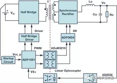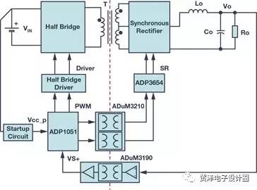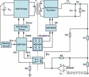 圖3顯示了實施數(shù)字隔離器解決方案的數(shù)字電源的功能框圖。雙通道數(shù)字隔離器ADuM3210用作數(shù)字隔離,可將來自副邊控制器ADP1051的PWM信號傳輸?shù)皆叞霕蝌?qū)動器。