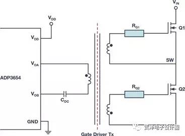 其中,VDD是初級繞組兩端的電壓,fs是開關(guān)頻率, ?B是半個開關(guān)周期內(nèi)的峰峰磁通密度變化,Ae是磁芯的等效橫截面積。當VOA驅(qū)動為高電平且VOB驅(qū)動為低電平時,Q1開啟,Q2關(guān)閉。當VOB驅(qū)動為高電平且VOA驅(qū)動為低電平時,Q2開啟,Q1關(guān)閉。需要注意的是,該柵極驅(qū)動變壓器適用于對稱半橋,不適用于非對稱半橋或其他有源鉗位拓撲。