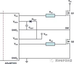 在圖5中,將ADuM7223隔離式柵極驅(qū)動器配置為自舉柵極驅(qū)動器來驅(qū)動半橋。DBST是外部自舉二極管,CBST是外部自舉電容。在低端MOSFET Q2開啟的每個周期內(nèi),VDD會通過自舉二極管為自舉電容充電。為最大限度降低功耗,需要使用正向壓降低且反向恢復(fù)時間短的超快二極管。