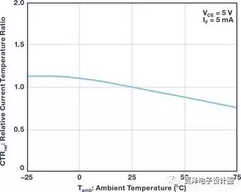 隔離數(shù)字電源中的輸出電壓通常需要快速準確的隔離反饋。光耦合器經(jīng)常用于將來自副邊的模擬信號發(fā)送到原邊,但其CTR會隨著溫度而發(fā)生極大變化,且性能也會隨著時間推移而下降。圖6顯示了TCET1100的歸一化CTR與環(huán)境溫度特性。在該圖中,CTR的變化率在–25°C到+75°C的范圍內(nèi)會超過30%。