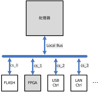 隨著數(shù)字示波器設(shè)計復(fù)雜性的增加和處理器處理能力的提升,總線結(jié)構(gòu)日益成為系統(tǒng)性能的瓶頸。傳統(tǒng)的入門級數(shù)字示波器,采用低成本的嵌入式處理器作為控制和處理核心,采用低成本的FPGA實現(xiàn)數(shù)據(jù)采集和存儲,二者之間通過并行的本地總線互連,處理器作為主設(shè)備,F(xiàn)PGA作為從設(shè)備;總線上同時還連接其他處理器外設(shè),如FLASH、USB控制器等,如圖4所示。