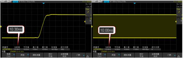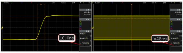 類似的,在SDS1000X-E(X-C)還有諸多這種PS和PL間相互協(xié)同處理而獲得的高性能數(shù)字信號處理。例如,SDS1000X-E(X-C)可以對14M 全采樣點進行多種測量和串行協(xié)議解碼,而這是在許多中、高端示波器中都做不到的。圖7中,上方兩圖為某主流中端示波器對10ns上升沿的測量結(jié)果,下方兩圖為SDS1000X-E(X-C)對相同信號的測量結(jié)果。可以看到,在小時基下,二者的測量結(jié)果都較為精確,與實際上升時間相差不大,但在大時基下,右上圖顯示該示波器在100us/div下只能顯示"< 48ns"的測量結(jié)果,注意此時它的原始采樣率仍然有1GSa/s,這說明此時它的測量對象并不是原始波形數(shù)據(jù),而是經(jīng)過壓縮后映射到屏幕上的數(shù)據(jù)。右下圖顯示SDS1000X-E(X-C)在1ms/div的時基下的測量結(jié)果,注意此時的采樣率同樣為1GSa/s,但顯示的測量精度仍然達到了1ns,能夠較為真實地反映信號的參數(shù)。