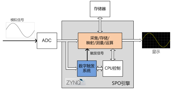 Zynq-7000豐富的硬件資源,為SDS1000X-E(X-C)的數(shù)字信號處理功能提供了強大的支撐。SDS1000X-E(X-C)中采用的XC7Z020 SoC芯片,PS部分具有雙核ARM Cortex-A9處理器,最高主頻為866MHz,并行協(xié)處理器NEON可以在軟件層面執(zhí)行數(shù)字信號處理;PL部分具有220個DSP Slice和4.9Mb Block RAM;加上PS和PL之間數(shù)據(jù)接口極高的吞吐率,使得我們可以靈活地為不同的數(shù)字信號處理配置不同的硬件資源。