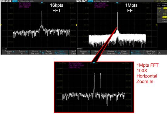 有些復(fù)雜的功能,則可以利用PS和PL間的高數(shù)據(jù)帶寬進行協(xié)同處理,例如FFT運算,在PL側(cè)利用豐富的DSP Slice和Block RAM資源構(gòu)建協(xié)處理器對基本FFT運算進行硬件加速,PS側(cè)則實現(xiàn)復(fù)雜的窗函數(shù)計算、繪圖、UI等操作?;谶@種協(xié)同處理的架構(gòu),SDS1000X-E(X-C)上的FFT支持高達1M點的FFT,在獲得極高的頻譜分辨率的同時,還能大大加快頻譜的刷新速度。圖6顯示了在SDS1000X-E(X-C)上分別進行16k點和1M點FFT的頻譜分辨率對比。此例中我們給示波器輸入了一個雙音信號,其頻率為100MHz和100.05MHz,從16k點FFT獲得的頻譜圖中我們無法分辨如此靠近的兩個正弦信號,信號被作為一個頻率顯示出來;而1M點FFT的頻譜圖有著明顯更細致的頻譜以及信號處理增益,從水平100倍展開的圖中可以看出,兩個相距50kHz的正弦型號能夠被很好地區(qū)分開。
