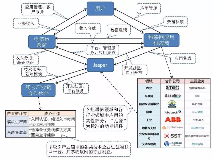 特別是對(duì)于電信運(yùn)營商和物聯(lián)網(wǎng)應(yīng)用提供商(各行業(yè)的系統(tǒng)開發(fā)商),這兩者同時(shí)作為Jasper的目標(biāo)客戶,在Jasper平臺(tái)的“牽線搭橋”(資源整合)下,與其它的產(chǎn)業(yè)鏈企業(yè)共同構(gòu)建物聯(lián)網(wǎng)應(yīng)用,共建共贏、各得其所。