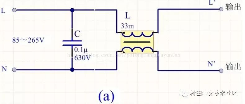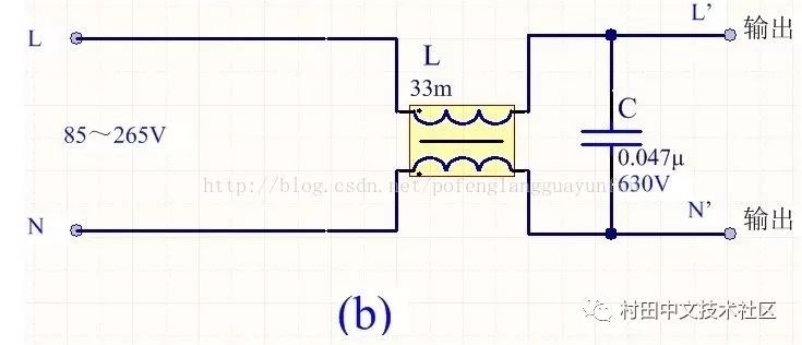 為降低成本和減小體積,開(kāi)關(guān)電源一般采用簡(jiǎn)易的EMI濾波器,主要包括共模扼流圈L和濾波電容,以下四種可以根據(jù)情況進(jìn)行選擇:
