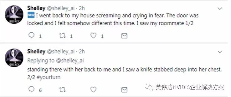 起初,Shelley 每隔一個小時在其推文中編寫新故事,當關(guān)注者回應(yīng)新句子時,它就能通過這句話以及此前所有信息來確定符合邏輯的下一個句子,從而不斷編寫與關(guān)注者興趣點高度一致的故事。它的近期成品如下: