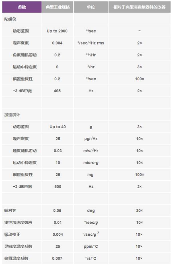表6.工業(yè)MEMS器件對(duì)所有已知潛在誤差源進(jìn)行全面測(cè)定,通常能實(shí)現(xiàn)消費(fèi)類(lèi)器件高出一個(gè)數(shù)量級(jí)或更高的精度水平