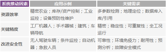 工業(yè)系統(tǒng)智能檢測(cè)的推動(dòng)因素工業(yè)機(jī)械和流程最具價(jià)值的進(jìn)步集中在有形的系統(tǒng)級(jí)優(yōu)勢(shì)上,而這通常會(huì)帶來(lái)設(shè)計(jì)和實(shí)現(xiàn)方面的挑戰(zhàn),這些挑戰(zhàn)又會(huì)發(fā)展成新的問(wèn)題解決方案和業(yè)務(wù)模式。這種系統(tǒng)級(jí)推動(dòng)因素可以歸納為三項(xiàng)追求,即對(duì)資源效率、關(guān)鍵精度和更高安全性的追求。瞄準(zhǔn)這些橫跨多個(gè)行業(yè)的改進(jìn)的應(yīng)用,包括跨越空中/地面/海上、室內(nèi)/室外、短期/長(zhǎng)期和人/機(jī)等,但無(wú)論如何,它們都依賴(lài)于共同的屬性;即精度、可靠性、安全性和智能處理與分析,如表1所示。