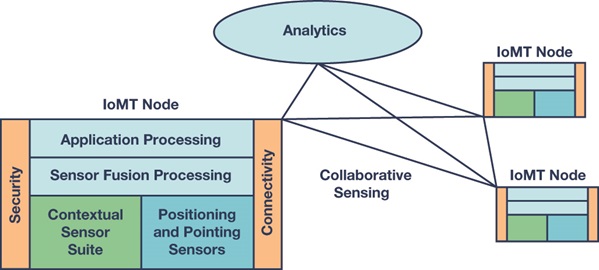 運(yùn)動(dòng)物聯(lián)網(wǎng)節(jié)點(diǎn)輸出的有效性和價(jià)值最為依賴(lài)的是核心傳感器的質(zhì)量以及它們高保真地捕捉應(yīng)用情境的能力。因此,融合處理是傳感器校正/增強(qiáng)的必然選擇,也是理想捕捉傳感器間狀態(tài)動(dòng)態(tài)的必備條件(例如,在任意給定時(shí)間點(diǎn),哪個(gè)傳感器最可靠)。應(yīng)用級(jí)的處理以分層方式融入解決方案之中,并根據(jù)環(huán)境特點(diǎn)進(jìn)行優(yōu)化,包括適當(dāng)?shù)倪吔鐥l件。雖然這種方式是自動(dòng)的,但在有些情況下,這些節(jié)點(diǎn)會(huì)協(xié)同工作,比如在地面或空中成群的無(wú)人駕駛交通工具中。在這些情況下會(huì)部署安全鏈路,強(qiáng)調(diào)可靠傳輸和受保護(hù)的特有身份信息,如圖2所示。