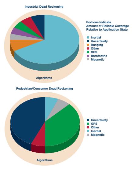 與其形成鮮明對(duì)比的是,工業(yè)導(dǎo)航定位推算方案是針對(duì)系統(tǒng)性能定義而設(shè)計(jì)的,要根據(jù)具體精度要求選擇組件。更高質(zhì)量的慣性傳感器允許其發(fā)揮主要作用,適當(dāng)利用其他傳感器來(lái)縮小不確定性差距。比起推算/估算可靠的傳感器讀數(shù)間的位置,算法在概念上更關(guān)注最佳權(quán)重、切換和傳感器互補(bǔ),以及對(duì)于環(huán)境和實(shí)時(shí)運(yùn)動(dòng)動(dòng)力學(xué)的認(rèn)識(shí)。