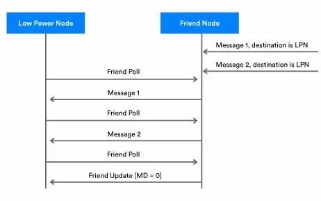 · 在每個接收到來自“Friend”節(jié)點的消息之后,LPN將繼續(xù)發(fā)送“Friend Poll”消息,直到收到“MD(MD =更多數(shù)據(jù))”字段設(shè)置為0的“FriendUpdate”消息為止。這意味著LPN沒有更多消息被緩沖。此時,LPN停止輪詢“Friend”節(jié)點。
