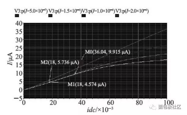 根據(jù)電路結(jié)構(gòu)可以直接計算得出電路理論上實現(xiàn)電流縮小3600倍。電路中各個晶體管尺寸的最終確定是通過對不同器件尺寸電路的仿真結(jié)果對比得到的。
