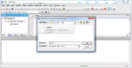 4、雙擊需要添加的文件main.c,或者選中它再點擊Add按鈕,從左邊的Project窗口就可以看到,文件就已經(jīng)被添加到工程中了。這時彈出的窗口并沒有關(guān)閉,因為這樣可以方便繼續(xù)添加其他文件。因為我們現(xiàn)在只需添加一個文件并且添加好了,所以點擊Close關(guān)閉彈出的窗口。