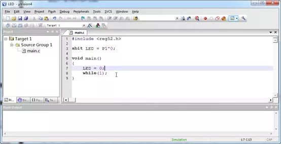 1、我們打開main.c,開始正式編寫程序了。我們編寫的程序如下并保存。至于這個程序是什么含義,之后將詳細介紹。注意一點,我給出的程序中設置的LED是P1.0,如果你的開發(fā)板或者自己搭建的電路中LED的IO口不是P1.0,你需要照著我給出的格式修改sbit那一行。這一點也充分體現(xiàn)了,單片機編程是和實際硬件電路息息相關(guān)的,程序和電路要配套,才能正常運行。