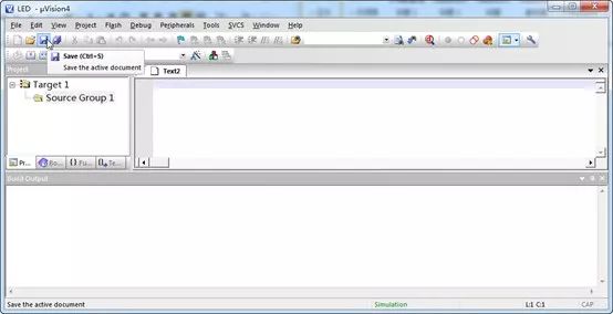 2、然后我們點擊保存按鈕,將其保存到工程文件夾Project01 – LED中,保存為擴展名是“.c”的文件,如main.c。這里大家要注意的是,源文件其實只是一個普通的文本文件,不過擴展名是c而不是txt。我們剛剛新建main.c文件的操作,也可以通過在資源管理器中新建文本文檔,然后重命名為main.c的方式進行。