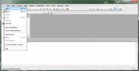 1、工程新建并配置完成了,下面我們開始新建程序源文件。點擊菜單中的File-New,出現(xiàn)一個新的文件,如圖。
