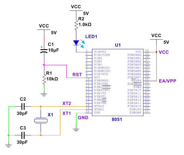 由于我們用的51單片機是5V供電,而LED需要3V電壓,所以我們需要在LED上串聯(lián)合適的電阻,否則會燒壞器件。我們可以選用P0~P3共32個IO口中的任何一個,這里選擇的是P1.0。電路圖如下,電阻取值推薦為330Ω ~ 1kΩ之間。