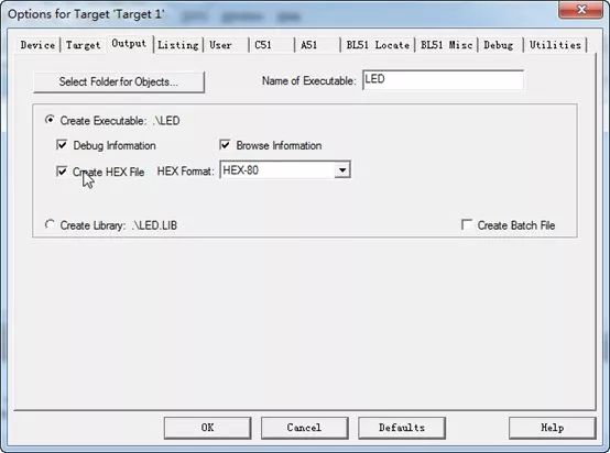 7、我們打開Output標簽,并勾選Create HEX File,然后點擊OK確認即可。