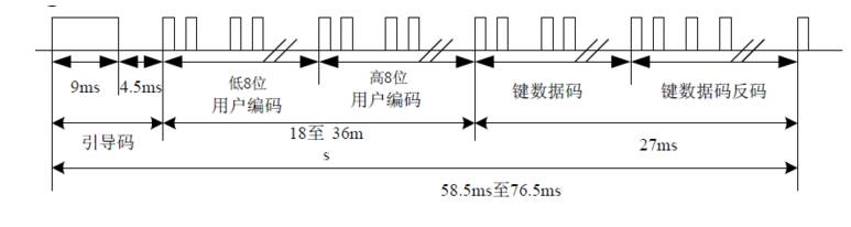 其中,引導(dǎo)碼高電平9ms,低電平4.5ms;系統(tǒng)碼8位,數(shù)據(jù)碼8位,共32位;其中前16位為用戶識別碼,能區(qū)別不同的紅外遙控設(shè)備,以防止不同的機(jī)種遙控碼互相干擾。后16位為8位的操作碼和8位的操作反碼,用于核對數(shù)據(jù)是否接收準(zhǔn)確。收端根據(jù)數(shù)據(jù)碼做出應(yīng)該執(zhí)行上面動作的判斷。