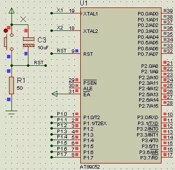 大家可以看到復位電路中電阻R1=10k時RST是高電平 ,而當R1=50時RST為低電平,很明顯R1=10k時是錯誤的,單片機一直處在復位狀態(tài)時根本無法工作。出現(xiàn)這樣的原因是由于RST引腳內含三極管,即便在截止狀態(tài)時也會有少量截止電流,當R取的非常大時,微弱的截止電流通過就產生了高電平。