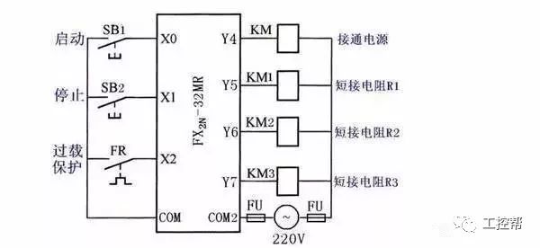 PLC的輸出信號:電源接觸器KM、短接R1接觸器KM1、短接R2接觸器KM