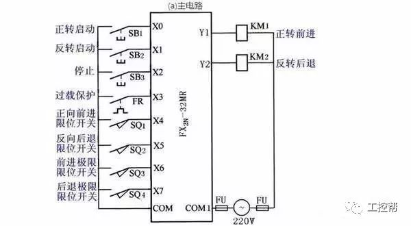PLC的輸入信號:正轉(zhuǎn)啟動按鈕SB1,反轉(zhuǎn)啟動按鈕SB2,停止按鈕SB3,熱繼電器常開觸點FR、正向前進(jìn)限位開關(guān)SQ1、反向后退限位開關(guān)SQ2、前進(jìn)極限限位開關(guān)SQ3、后退極限限位開關(guān)SQ4。