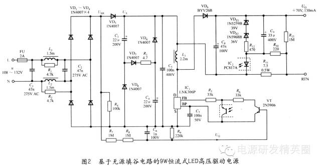 由LinkSwitch-TN系列產品LNK306P構成的基于無源填谷電路的9W恒流式LED高壓驅動電源如圖2所示。該電路主要有以下特點: