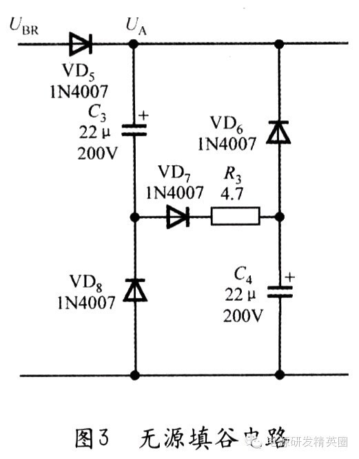 全部由無源元器件構成的無源填谷電路如圖3所示??偣矁H需使用3只二極管(VD6~VD8)、兩只電解電容器(C3、C4)和一只電阻器(R3)。 VD6~VD8采用1N4007型硅整流管。C3與C4的容量必須相等,均采用22μF/200V的電解電容器。R3選用4.7Ω、2W的電阻器,開機時可限制C3、C4上的沖擊電流。填谷電路的特點是C3和C4以串聯(lián)方式充電,而以并聯(lián)方式進行放電。VD5為隔離二極管,可將整流橋與填谷電路隔離開。設交流輸入電壓的有效值為u,峰值電壓為UP,整流橋輸出的脈動直流電壓為UBR,VD5右端電壓為UA(此即C3和C4上的總電壓)。