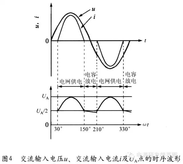 不難看出,從階段一一直到階段三,都是由電網供電,除了向負載提供電流,還在階段一至階段二給C3和C4充電;僅在階段四由C3、C4上儲存的電荷給負載供電。
