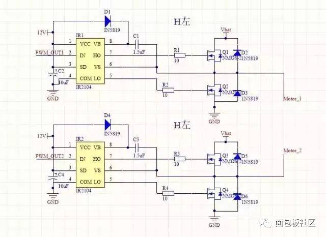 使用兩片IR2104型半橋驅(qū)動芯片可以組成完整的直流電機H橋式驅(qū)動電路,而且IR2104價格低廉,功能完善,輸出功率相對HIP4082較低,此方案采用較多。