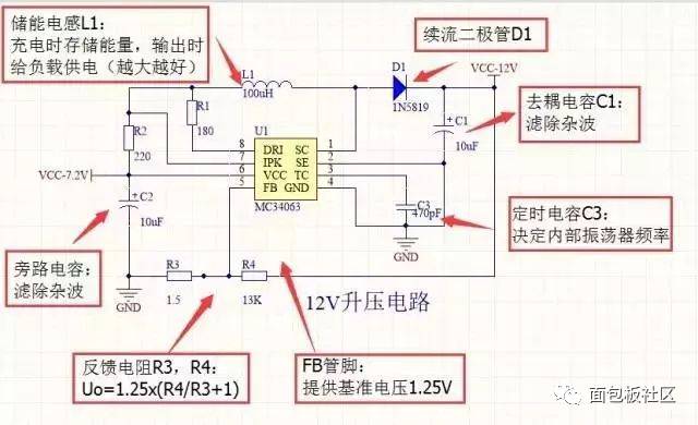 MC34063屬于開關(guān)型直流穩(wěn)壓芯片(可用于升/降壓),此類電路功耗小、效率高、體積小、重量輕、穩(wěn)壓范圍寬,但其電路結(jié)構(gòu)較復(fù)雜、故障率較高。其工作原理是,升壓時其芯片內(nèi)部通過開關(guān)管不斷導(dǎo)通(其頻率與定時電容有關(guān)),儲能電感與電容短時間內(nèi)不斷充放電對負載提供能量(電感可以選的大一點)以輸出連續(xù)的直流電壓,另Uo=1.25*(1+R4/R3)(參見手冊公式)。