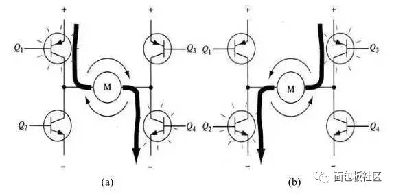 電機驅(qū)動主要采用N溝道MOSFET構(gòu)建H橋驅(qū)動電路,H 橋是一個典型的直流電機控制電路,因為它的電路形狀酷似字母 H,故得名曰“H 橋”。4個開關(guān)組成 H 的 4 條垂直腿,而電機就是H中的橫杠。要使電機運轉(zhuǎn),必須使對角線上的一對開關(guān)導(dǎo)通,通過不同的電流方向來控制電機正反轉(zhuǎn),其連通電路如圖所示。
