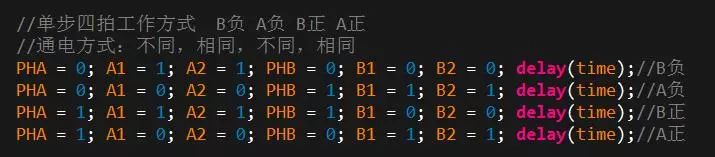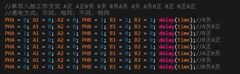 大家可以發(fā)現(xiàn)上面三塊代碼的第一行注釋就是工作方式的線圈通電方式,但是第二行是啥?什么 “相同”、“不同”的?