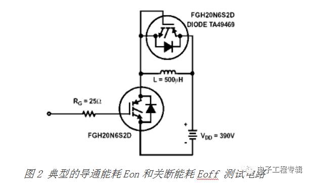 這種延遲引起了類飽和 (Quasi-saturation) 效應(yīng),使集電極/發(fā)射極電壓不能立即下降到其VCE(sat)值。這種效應(yīng)也導(dǎo)致了在ZVS情況下,在負(fù)載電流從組合封裝的反向并聯(lián)二極管轉(zhuǎn)換到 IGBT的集電極的瞬間,VCE電壓會上升。IGBT產(chǎn)品規(guī)格書中列出的Eon能耗是每一轉(zhuǎn)換周期Icollector與VCE乘積的時間積分,單位為焦耳,包含了與類飽和相關(guān)的其他損耗。其又分為兩個Eon能量參數(shù),Eon1和Eon2。Eon1是沒有包括與硬開關(guān)二極管恢復(fù)損耗相關(guān)能耗的功率損耗;Eon2則包括了與二極管恢復(fù)相關(guān)的硬開關(guān)導(dǎo)通能耗,可通過恢復(fù)與IGBT組合封裝的二極管相同的二極管來測量,典型的Eon2測試電路如圖2所示。IGBT通過兩個脈沖進(jìn)行開關(guān)轉(zhuǎn)換來測量Eon。第一個脈沖將增大電感電流以達(dá)致所需的測試電流,然后第二個脈沖會測量測試電流在二極管上恢復(fù)的Eon損耗。