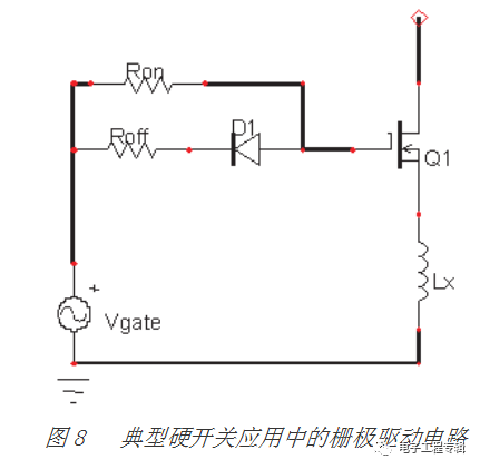 圖2顯示了用于測量IGBT Eoff的典型測試電路, 它的測試電壓,即圖2中的VDD,因不同制造商及個別器件的BVCES而異。在比較器件時應(yīng)考慮這測試條件中的VDD,因為在較低的VDD鉗位電壓下進(jìn)行測試和工作將導(dǎo)致Eoff能耗降低。降低柵極驅(qū)動關(guān)斷阻抗對減小IGBT Eoff損耗影響極微。如圖1所示,當(dāng)?shù)刃У亩鄶?shù)載流子MOSFET關(guān)斷時,在IGBT少數(shù)載流子BJT中仍存在存儲時間延遲td(off)I。不過,降低Eoff驅(qū)動阻抗將會減少米勒電容 (Miller capacitance) CRES和關(guān)斷VCE的 dv/dt造成的電流注到柵極驅(qū)動回路中的風(fēng)險,避免使器件重新偏置為傳導(dǎo)狀態(tài),從而導(dǎo)致多個產(chǎn)生Eoff的開關(guān)動作。ZVS和ZCS拓?fù)湓诮档蚆OSFET 和 IGBT的關(guān)斷損耗方面很有優(yōu)勢。不過ZVS的工作優(yōu)點(diǎn)在IGBT中沒有那么大,因為當(dāng)集電極電壓上升到允許多余存儲電荷進(jìn)行耗散的電勢值時,會引發(fā)拖尾沖擊電流Eoff。ZCS拓?fù)淇梢蕴嵘畲蟮腎GBT Eoff性能。正確的柵極驅(qū)動順序可使IGBT柵極信號在第二個集電極電流過零點(diǎn)以前不被清除,從而顯著降低IGBT ZCS Eoff 。MOSFET的 Eoff能耗是其米勒電容Crss、柵極驅(qū)動速度、柵極驅(qū)動關(guān)斷源阻抗及源極功率電路路徑中寄生電感的函數(shù)。該電路寄生電感Lx (如圖8所示) 產(chǎn)生一個電勢,通過限制電流速度下降而增加關(guān)斷損耗。在關(guān)斷時,電流下降速度di/dt由Lx和VGS(th)決定。如果Lx=5nH,VGS(th)=4V,則最大電流下降速度為VGS(th)/Lx=800A/μs。