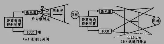距離選通成像系統(tǒng)采用一個(gè)脈沖激光器,具有選通功能的像增強(qiáng)型CCD成像期間,通過(guò)對(duì)接收器口徑進(jìn)行選通來(lái)減小從目標(biāo)返回到探測(cè)器的激光后向散射。在該系統(tǒng)中,非常短的激光脈沖照射物體,照相機(jī)快門打開(kāi)的時(shí)間相對(duì)于照射物體的激光發(fā)射時(shí)間有一定的延遲,并且快門打開(kāi)的時(shí)間很短,在這段時(shí)間內(nèi),探測(cè)器接收從物體返回的光束,從而排除了大部分的后向散射光。由于從物體返回來(lái)的第一個(gè)光子經(jīng)受的散射最小,所以選通接收最先返回的光子束可以獲得最好的成像效果。如果要獲得物體的三維信息,可以通過(guò)使用多個(gè)探測(cè)器設(shè)置不同的延遲時(shí)間來(lái)獲得物體在不同層次的信息,因而它提供了成像物體準(zhǔn)三維信息的能力。