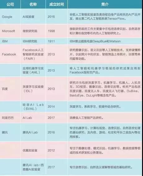 下圖整理了各大巨頭的AI實驗室的名稱、成立年份、簡介: