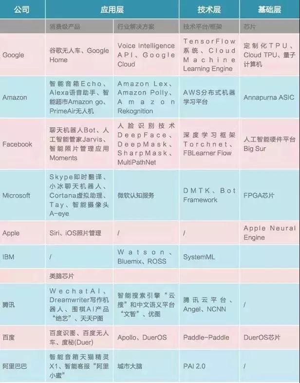 引領(lǐng)AI產(chǎn)業(yè)發(fā)展的技術(shù)競賽,主要是巨頭之間的角力。目前,蘋果、谷歌、微軟、亞馬遜、Facebook五大巨頭都在人工智能領(lǐng)域部署更多的資源;不僅國外巨頭如此,國內(nèi)的BAT都卯足馬力,積極布局人工智能。