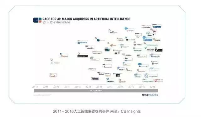 除了成立實驗室以外,巨頭們一會通過投資和并購儲備人工智能研發(fā)人才和技術(shù)。其中,Google于2014年以4億美元收購了深度學(xué)習(xí)算法公司 Deepmind,該公司開發(fā)的AlphaGo為Google的人工智能添上了濃墨重彩的一筆。
