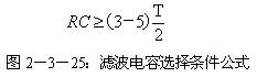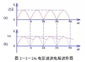 電容濾波電路圖見圖2-3-23,電容濾波電路是利用電容的充放電原理達到濾波的作用。在脈動直流波形的上升段,電容C1充電,由于充電時間常數很小,所以充電速度很快;在脈動直流波形的下降段,電容C1放電,由于放電時間常數很大,所以放電速度很慢。在C1還沒有完全放電時再次開始進行充電。這樣通過電容C1的反復充放電實現了濾波作用。濾波電容C1兩端的電壓波形見圖2-3-24(b)。